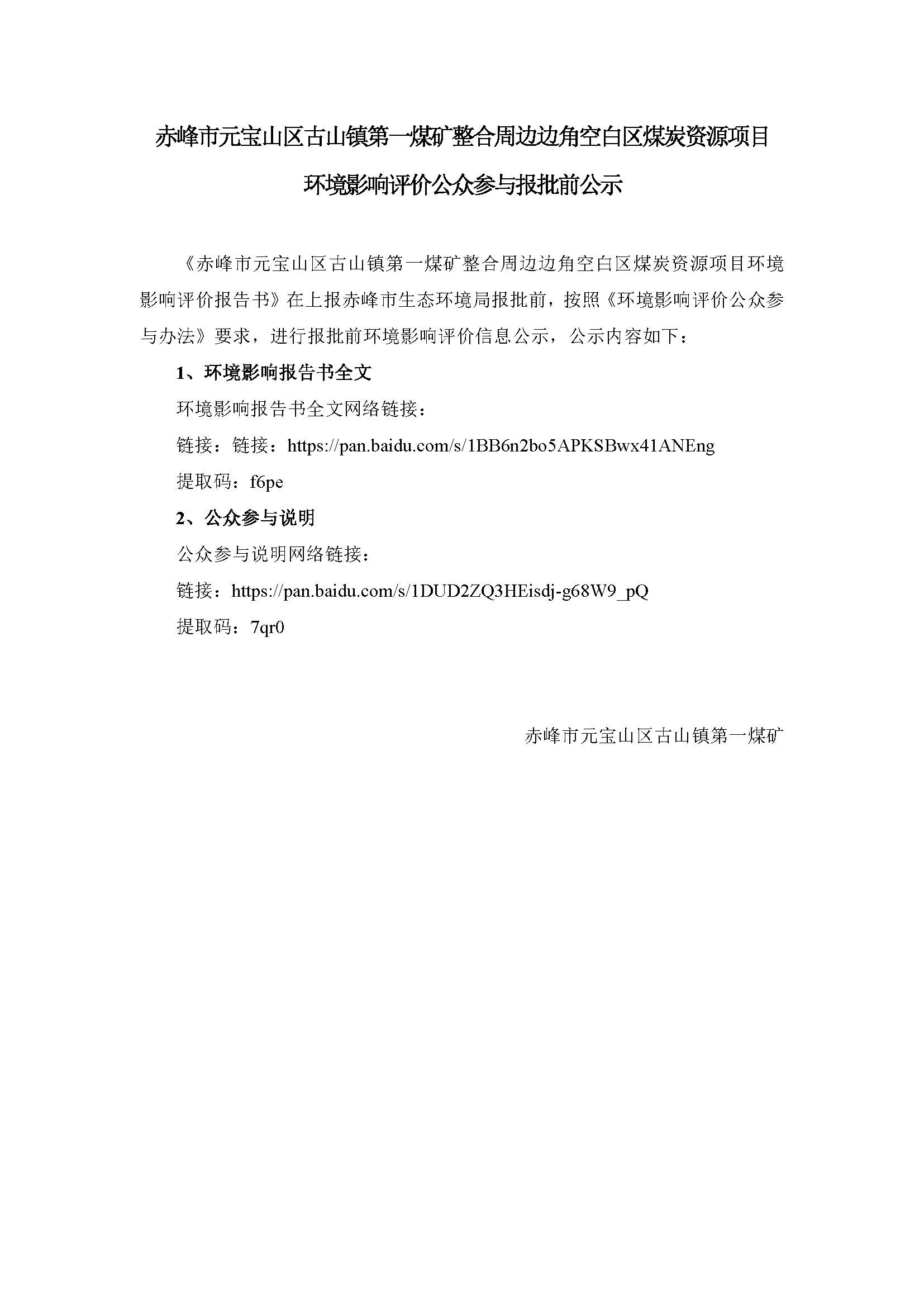 赤峰市元宝山区古山镇第一煤矿整合周边边角空白区煤炭资源项目环境影响评价公众参与报批前公示