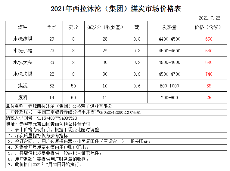 西拉沐沦(集团)最新煤价表(2021.7.22)