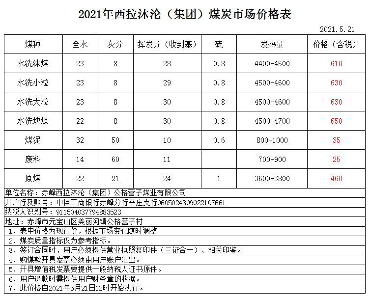 西拉沐沦(集团)最新煤价表(2021.5.21)